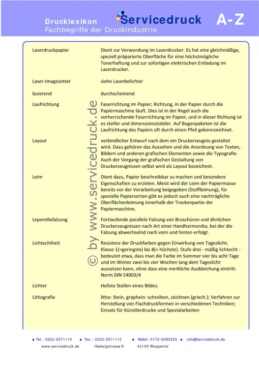 Drucklexikon Fachbegriffe der Druckindustrie Laserdruckpapier Servicedruck A-Z Dient zur Verwendung im Laserdrucker. Es hat eine gleichmäßige, speziell präparierte Oberfläche für eine höchstmögliche Tonerhaftung und zur sofortigen elektrischen Entladung im Laserdrucker. siehe Laserbelichter durchscheinend LaserImagesetter lasierend Laufrichtung © by www.servicedruck.de Faserrichtung im Papier; Richtung, in der Papier durch die Papiermaschine läuft. Dies ist in der Regel auch die vorherrschende Faserrichtung im Papier, und in dieser Richtung ist es steifer und dimensionsstabiler. Auf Bogenpaketen ist die Laufrichtung des Papiers oft durch einen Pfeil gekennzeichnet. verbindlicher Entwurf nach dem ein Druckerzeugnis gestaltet wird. Dazu gehören das Aussehen und die Anordnung von Texten, Bildern und anderen grafischen Elementen sowie die Typografie. Auch der Vorgang der grafischen Gestaltung von Druckerzeugnissen selbst wird als Layout bezeichnet. Dient dazu, Papier beschreibbar zu machen und besondere Eigenschaften zu erzielen. Meist wird der Leim der Papiermasse bereits vor der Verarbeitung beigegeben (Stoffleimung), für spezielle Papiersorten gibt es jedoch auch eine nachträgliche Oberflächenleimung innerhalb der Trockenpartie der Papiermaschine. Fortlaufende parallele Falzung von Broschüren und ähnlichen Druckerzeugnissen nach Art einer Handharmonika, bei der die Falzung abwechselnd nach vorn und hinten erfolgt. Resistenz der Druckfarben gegen Einwirkung von Tageslicht; Klasse 1(=geringste) bis 8(= höchste). Stufe drei mäßig lichtecht bedeutet etwa, dass man die Farbe im Sommer vier bis acht Tage und im Winter zwei bis vier Wochen lang dem Tageslicht aussetzen kann, ohne dass eine merkliche Ausbleichung eintritt. Norm DIN 54003/4 Hellste Stellen eines Bildes. litho: Stein, graphein: schreiben, zeichnen (griech.); Verfahren zur Herstellung von Flachdruckformen in verschiedenen Techniken; Einsatz für Künstlerdrucke und Spezialarbeiten Layout Leim Leporellofalzung Lichtechtheit Lichter Lithografie Tel.: 0202-2571110 www.servicedruck.de Fax.: 0202-2571112 Hedwigstrasse 6 Mobil: 0172-5393253 42105 Wuppertal info@servicedruck.de