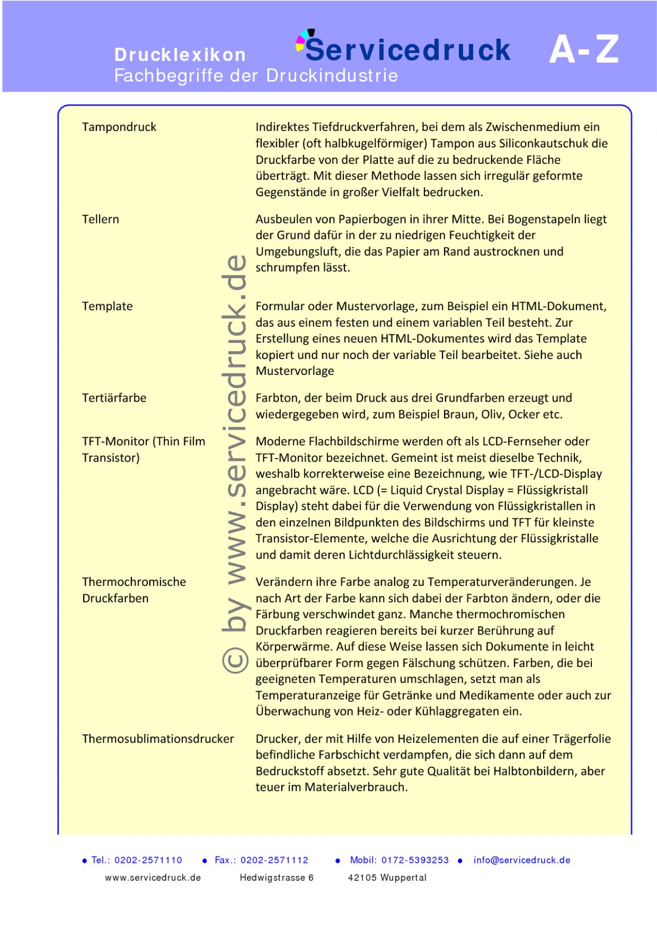 Drucklexikon Fachbegriffe der Druckindustrie Tampondruck Servicedruck A-Z Indirektes Tiefdruckverfahren, bei dem als Zwischenmedium ein flexibler (oft halbkugelförmiger) Tampon aus Siliconkautschuk die Druckfarbe von der Platte auf die zu bedruckende Fläche überträgt. Mit dieser Methode lassen sich irregulär geformte Gegenstände in großer Vielfalt bedrucken. Ausbeulen von Papierbogen in ihrer Mitte. Bei Bogenstapeln liegt der Grund dafür in der zu niedrigen Feuchtigkeit der Umgebungsluft, die das Papier am Rand austrocknen und schrumpfen lässt. Formular oder Mustervorlage, zum Beispiel ein HTMLDokument, das aus einem festen und einem variablen Teil besteht. Zur Erstellung eines neuen HTMLDokumentes wird das Template kopiert und nur noch der variable Teil bearbeitet. Siehe auch Mustervorlage Farbton, der beim Druck aus drei Grundfarben erzeugt und wiedergegeben wird, zum Beispiel Braun, Oliv, Ocker etc. Moderne Flachbildschirme werden oft als LCDFernseher oder TFTMonitor bezeichnet. Gemeint ist meist dieselbe Technik, weshalb korrekterweise eine Bezeichnung, wie TFT/LCDDisplay angebracht wäre. LCD (= Liquid Crystal Display = Flüssigkristall Display) steht dabei für die Verwendung von Flüssigkristallen in den einzelnen Bildpunkten des Bildschirms und TFT für kleinste TransistorElemente, welche die Ausrichtung der Flüssigkristalle und damit deren Lichtdurchlässigkeit steuern. Verändern ihre Farbe analog zu Temperaturveränderungen. Je nach Art der Farbe kann sich dabei der Farbton ändern, oder die Färbung verschwindet ganz. Manche thermochromischen Druckfarben reagieren bereits bei kurzer Berührung auf Körperwärme. Auf diese Weise lassen sich Dokumente in leicht überprüfbarer Form gegen Fälschung schützen. Farben, die bei geeigneten Temperaturen umschlagen, setzt man als Temperaturanzeige für Getränke und Medikamente oder auch zur Überwachung von Heiz oder Kühlaggregaten ein. Drucker, der mit Hilfe von Heizelementen die auf einer Trägerfolie befindliche Farbschicht verdampfen, die sich dann auf dem Bedruckstoff absetzt. Sehr gute Qualität bei Halbtonbildern, aber teuer im Materialverbrauch. Tellern Template Tertiärfarbe TFTMonitor (Thin Film Transistor) Thermochromische Druckfarben Thermosublimationsdrucker Tel.: 0202-2571110 www.servicedruck.de © by www.servicedruck.de Fax.: 0202-2571112 Hedwigstrasse 6 Mobil: 0172-5393253 42105 Wuppertal info@servicedruck.de